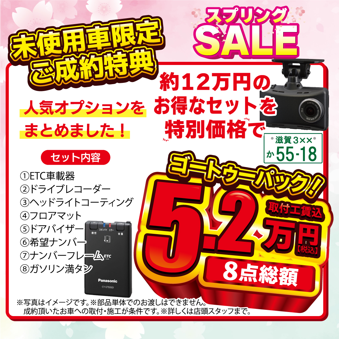さらに未使用車のご成約特典として約12万円分の人気オプション8点を52,000円でお買い求め頂ける「ゴートゥーパック」をご用意!