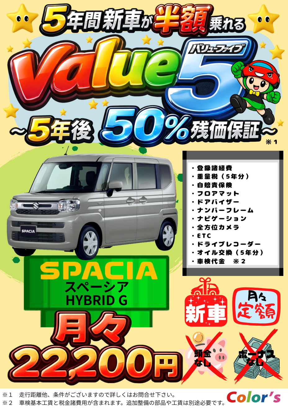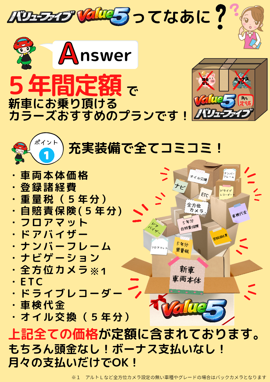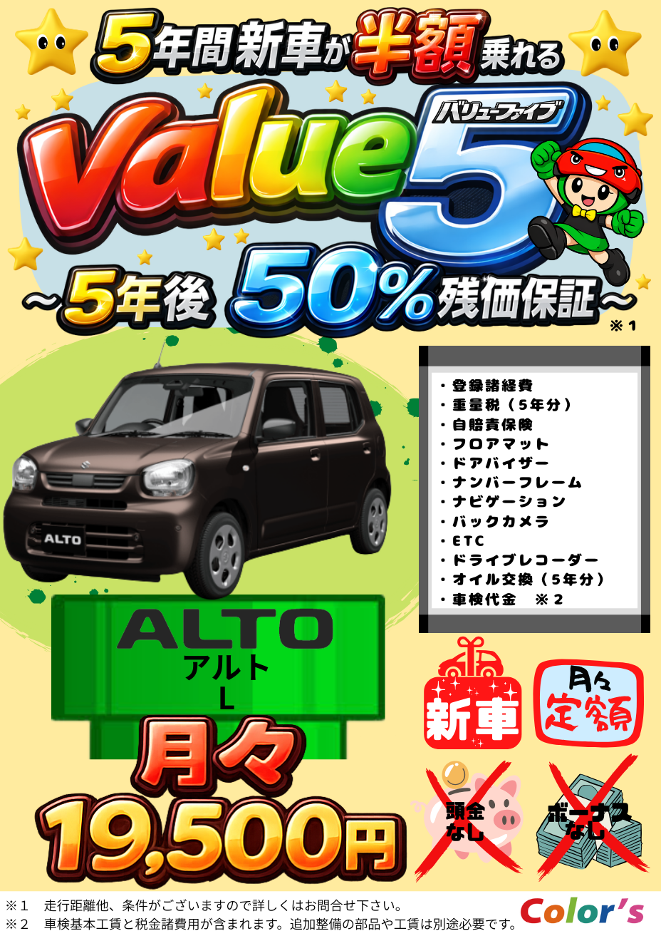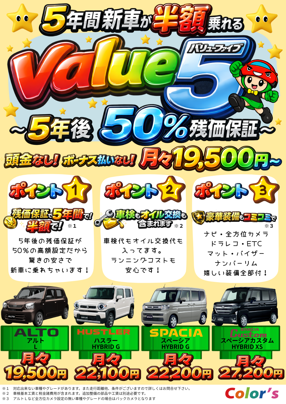 5年間新車が半額で乗れる『バリューファイブ』!!頭金なし!ボーナス無し!月々19500円~★滋賀県で車を買うならカラーズ★