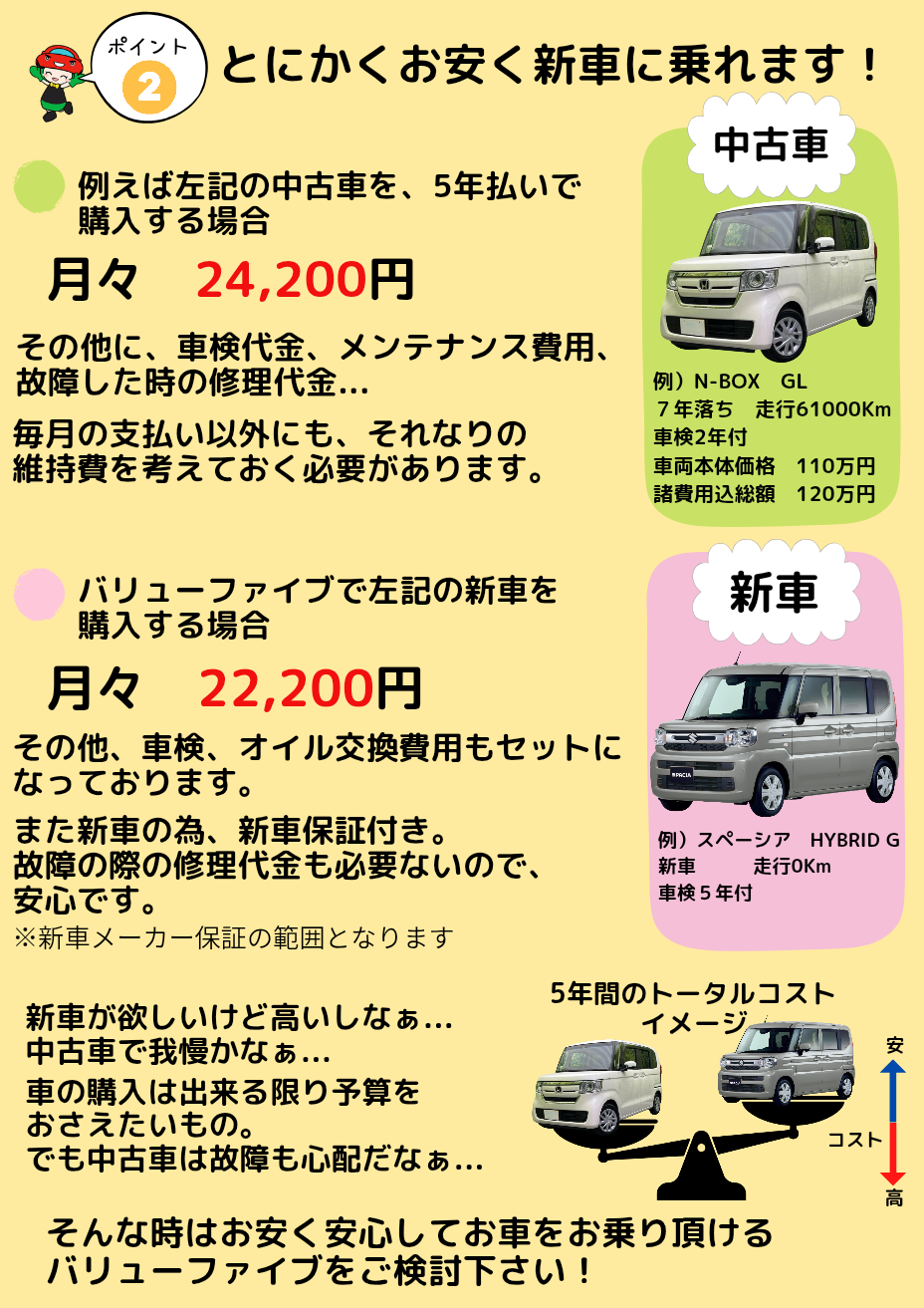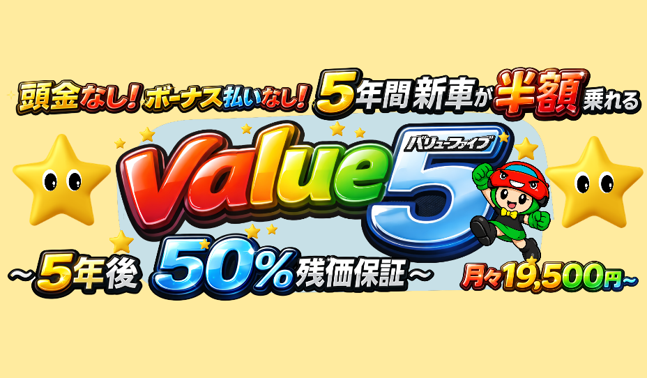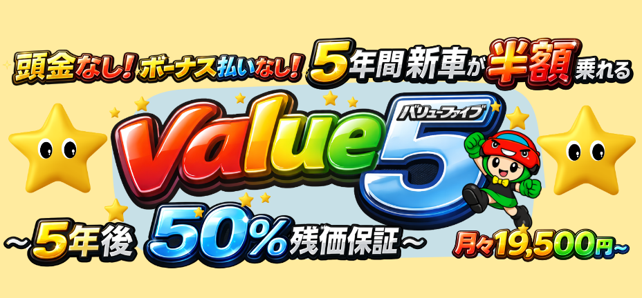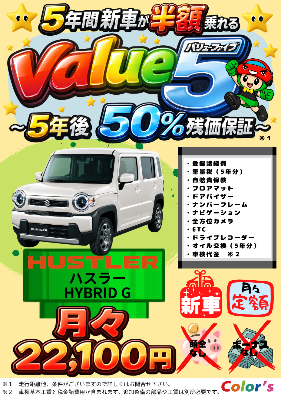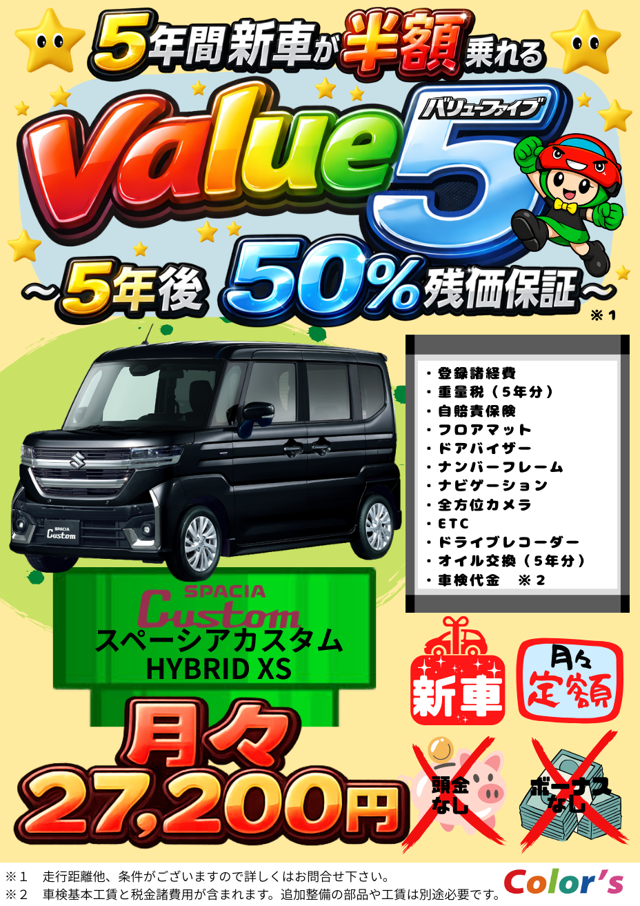 5年間新車が半額で乗れる『バリューファイブ』!!頭金なし!ボーナス無し!月々19500円~★滋賀県で車を買うならカラーズ★