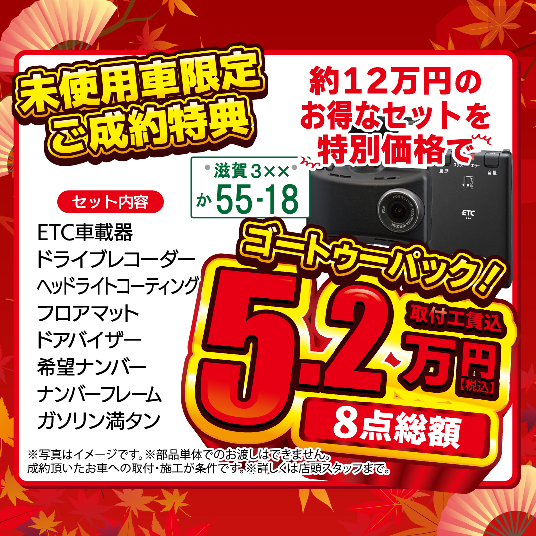未使用車をご購入時に装着する人気のオプション約12万円相当8点をまとめて52,000円でご購入頂けます。